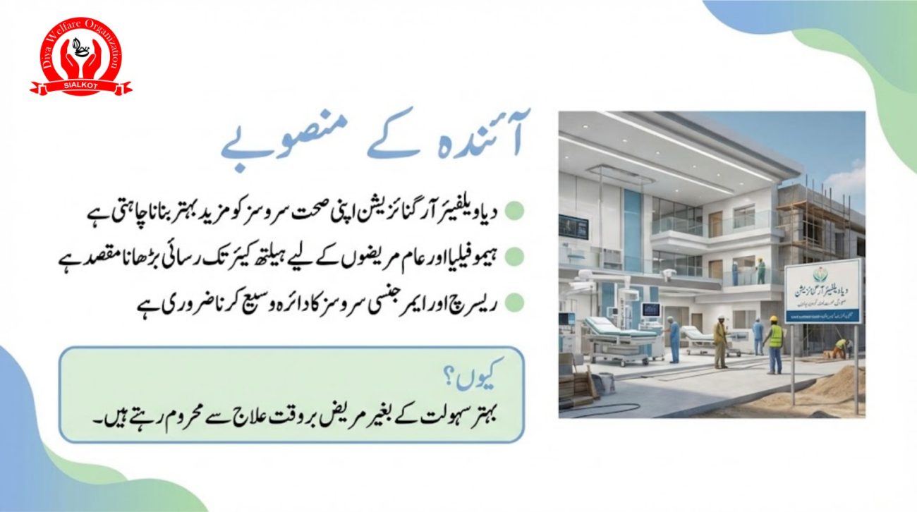 Diya Welfare Organization plans to expand its healthcare services in the future by developing advanced medical facilities and improving healthcare infrastructure.